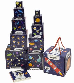 Caja con 7 piezas apilables y un pequeño libro para familiarizarse con nuevas palabras, números y animales.
